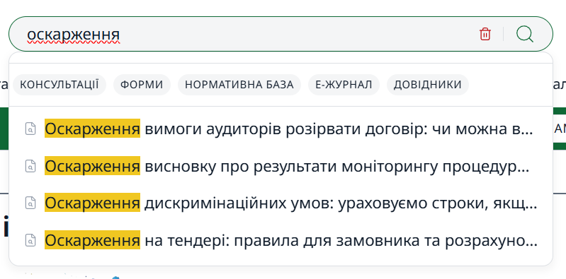 Наш пошук розумний! Він коректно працює з відмінками слів та друкарськими помилками. Коли ви починаєте щось набирати у пошуковому рядку, Система надає спливаючі підказки: