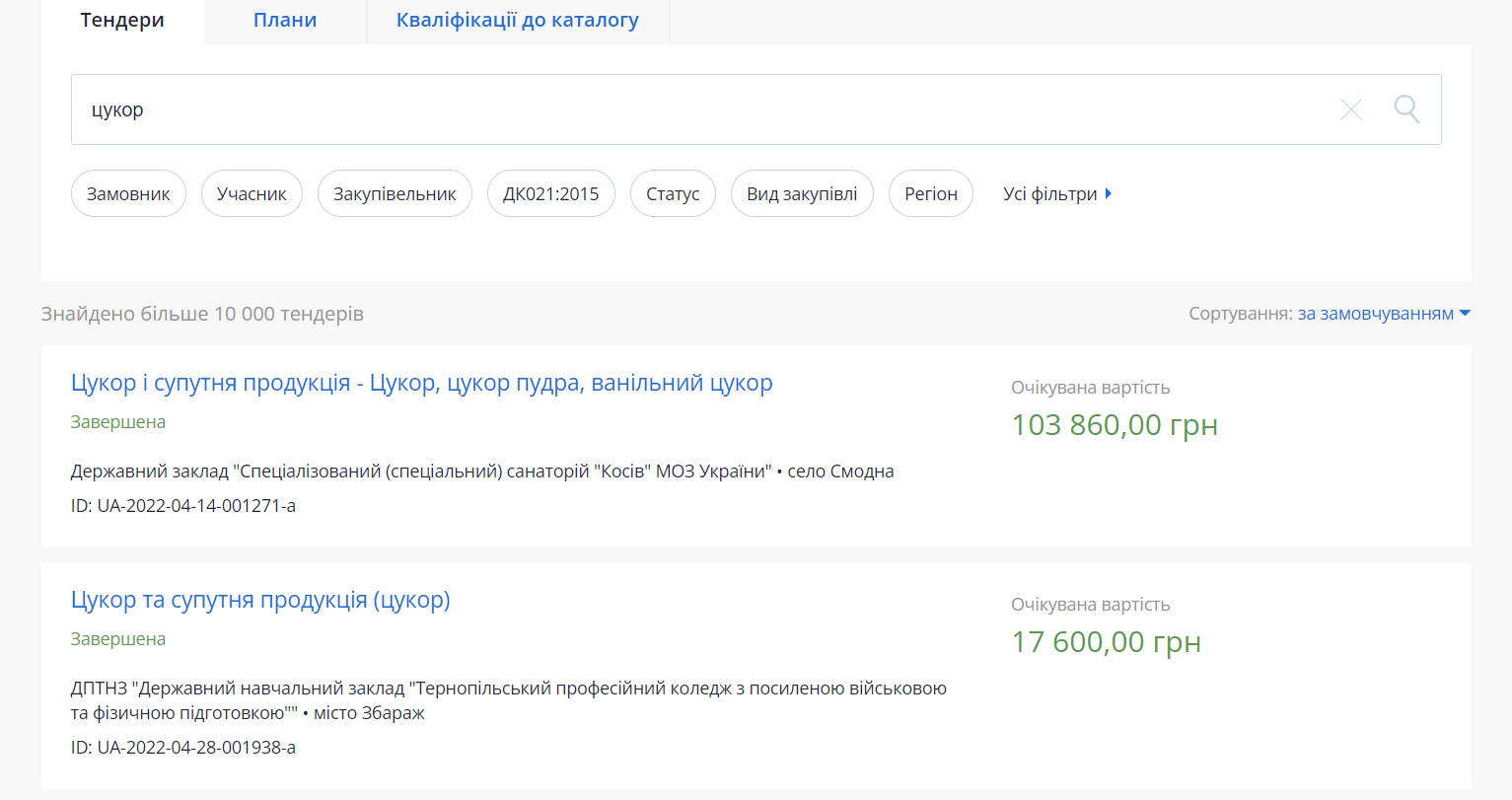 Спробуємо за допомогою інформації із Prozorro закупити цукор. Уводимо у рядок пошуку назву потрібного товару — цукор (рис. 1).