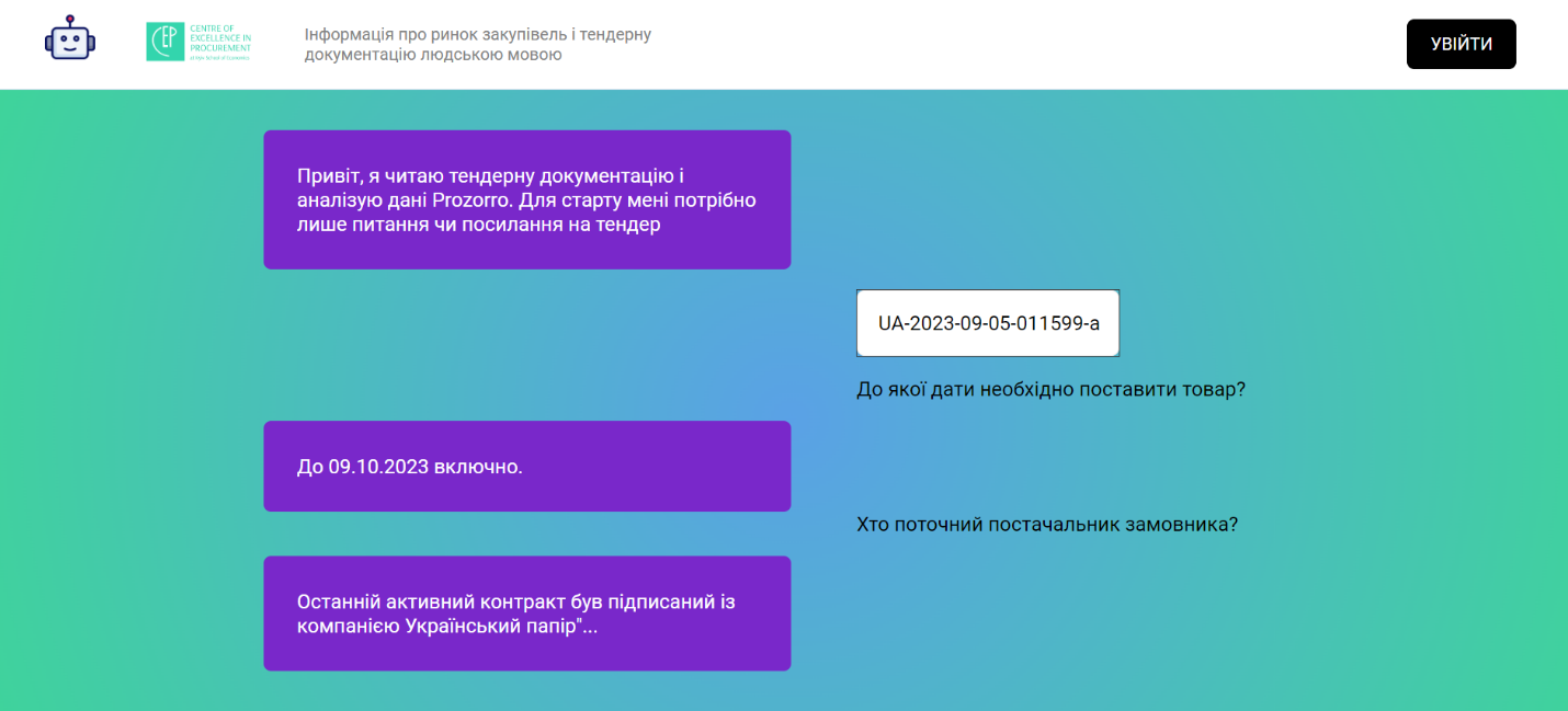 Користувач може написати в чаті конкретні запитання — наприклад, щодо термінів поставки, умови оплати, вимог до сертифікації. У відповіді — інформація з тендерних документів у зручному форматі.