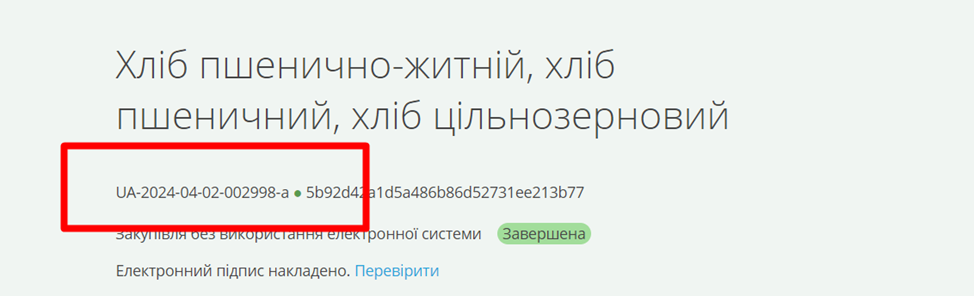 Ідентифікатор закупівлі генерується автоматично. Це унікальний номер у вигляді цифр та літер латиницею, загалом 22 символи.