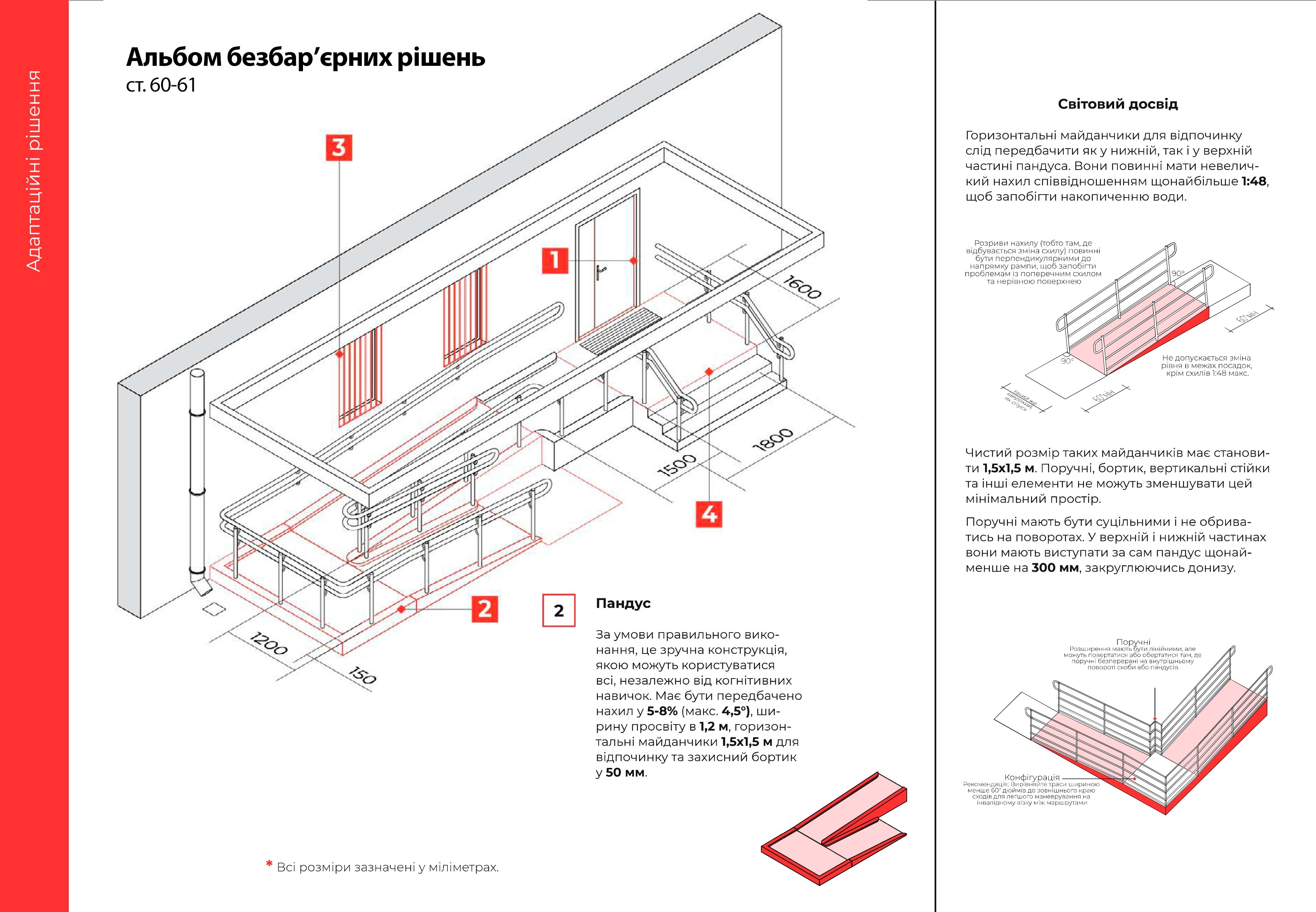 Першочерговим бар’єром у фізичній доступності будівель і споруд, пішохідних доріжок, переходів — є сходи, які для забезпечення доступності необхідно дублювати пандусом. Яким повинен бути нормативний пандус?