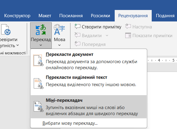 Коли треба терміново перекласти фрагмент тексту, на думку одразу спадає Google. Згадайте про Bing — фірмового вбудованого перекладача MS Office. Вам не доведеться виходити з файлу з текстом до браузера. У Bing доступні кілька десятків мов і три способи перекладу: перекласти документ, перекласти виділений текст, мініперекладач. Передусім відкрийте вкладку «Рецензування» і виберіть потрібний спосіб перекладу (рис. 1).