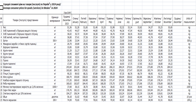 На сайті Держстату відображена, з-поміж іншої, інформація про поточні середні споживчі ціни на товари (послуги). Щоб її знайти, перейдіть у розділи Статистична інформація Економічна статистика Ціни Середні споживчі ціни на товари (послуги). Тут зможете завантажити файл з інформацією про середні споживчі ціни за місяцями 2024 року, зокрема, на продукти харчування (рис. 1).