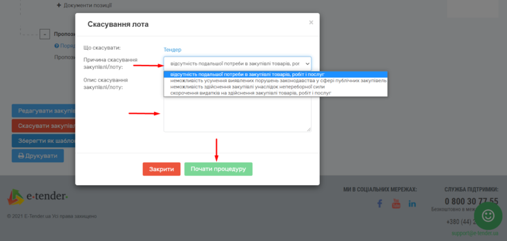 Крок 3. У вікні, що відкриється, оберіть причину скасування закупівлі/лоту. Наприклад, відсутність подальшої потреби у закупівлі товарів, робіт і послуг.
