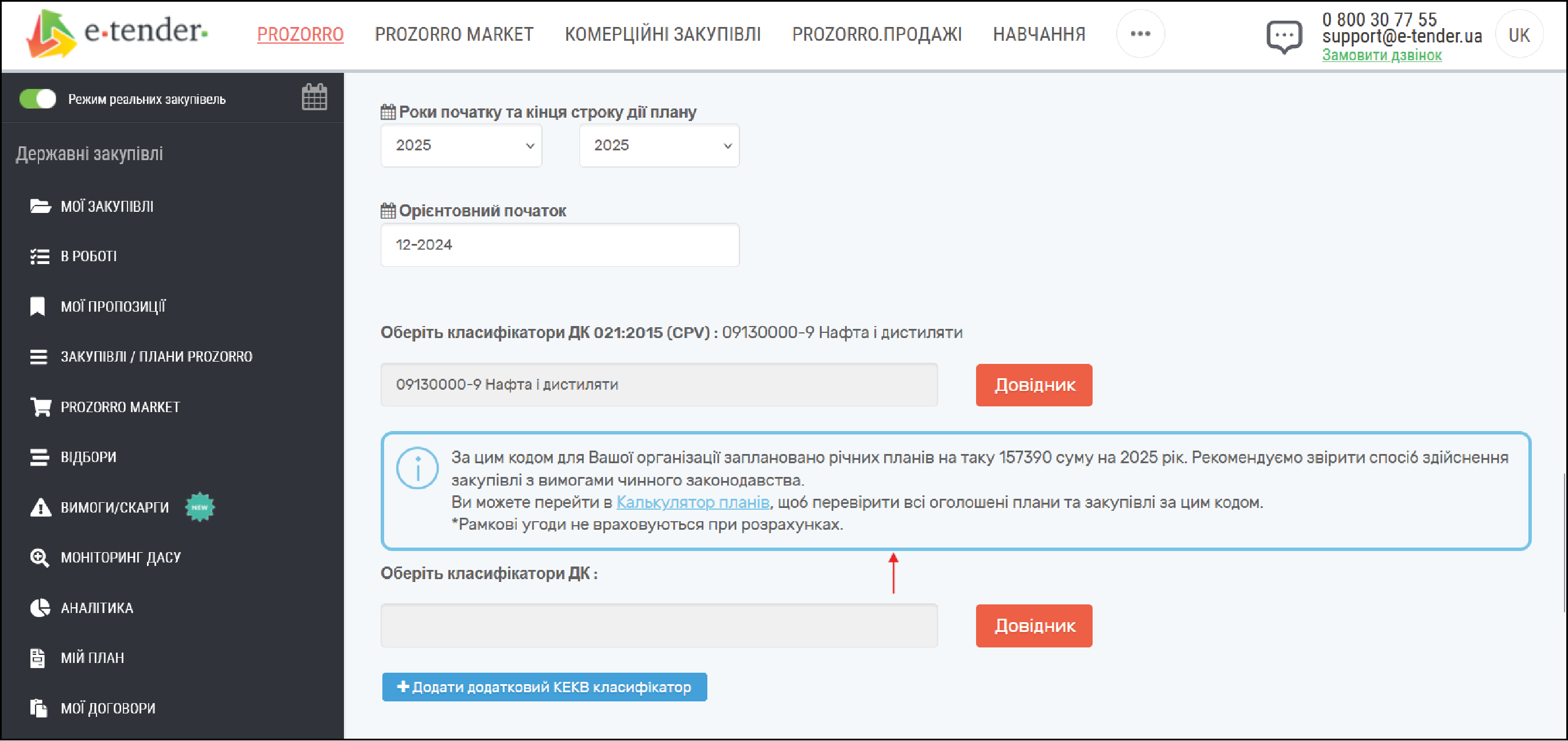 Коли уповноважена особа замовника публікує рядок річного плану закупівель, майданчик автоматично розрахує за вказаним кодом ДК 021:2015: