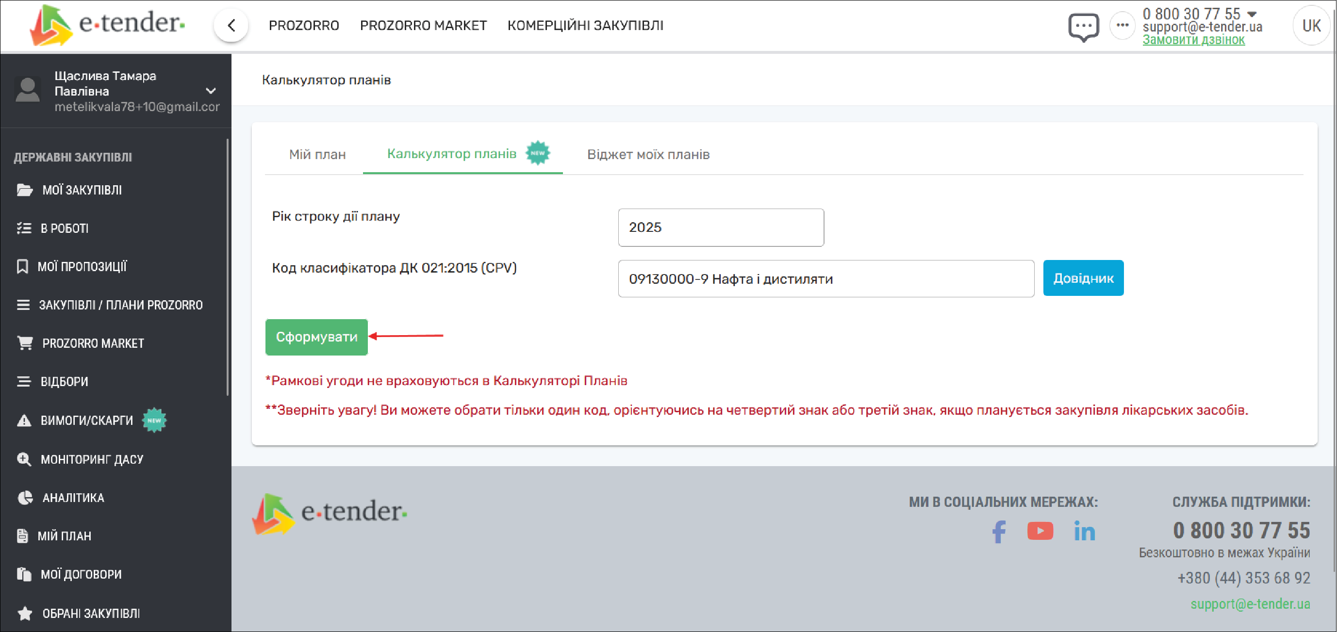 Для цього в полі «Рік строку дії плану» вкажіть рік — 2025. А в полі «Код класифікатора ДК 021:2015» оберіть код предмета закупівлі за класифікатором. Насамкінець натисніть Сформувати (рис. 2).